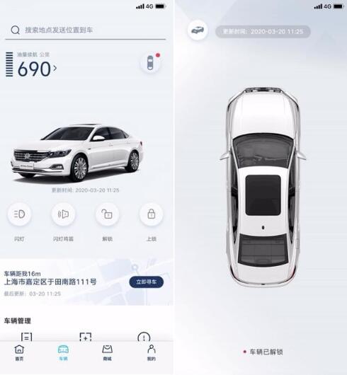 “在线寻车”功能能够方便用户寻找车库中忘记位置的车辆。每次车辆熄火时,通过4G网络可以将停车位置更新到云平台,用户便可以通过上汽大众超级App一键寻车。